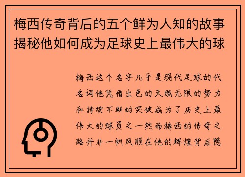 本文将通过对梅西与贝利进球纪录的历史对比,探讨两位足球传奇人物之间的代际传承。从不同的历史背景、竞技环境、球员技术特点到他们在各自时代的影响力,本文将逐一对比梅西与贝利的进球纪录及其背后的深远意义。足球不仅是一项竞技运动,它还是一代又一代球员的传承。通过分析梅西与贝利的进球成绩,我们能看到足球的演变...